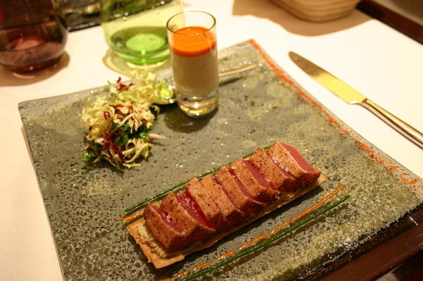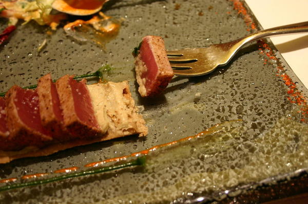 前菜是生鮪魚,四周以黑糊椒粉略煎出一層熟皮,刀切後再於生肉上撒點鹽花提味,最後拿三種沾料來劃盤,要辣的就是盤緣那橘色的一直線。