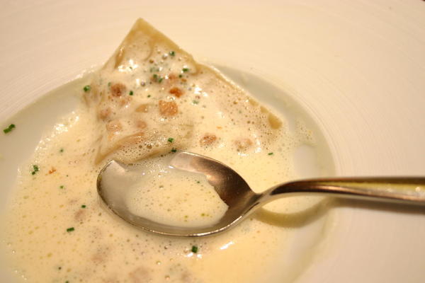 奶味控制得很恰當,浮於湯上的咖啡色顆粒物則有如一顆顆超迷你、超迷你的可頌(這時要說沒有小老鼠在廚房幫忙,已經沒人要信了),口感kaukau又有奶油香味;餃子雖然只是一大塊,但玄機就是在裏面包的香菇,肥潤得如同一塊塊肉,入口後菇汁濺出,美味與效果可比當年我們在上海吃的南翔蟹黃湯包;這是一份讓我們同時間發出讚嘆聲的菜色。