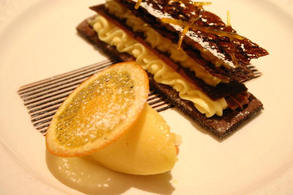 這裏有四層巧力,卻有三種作法,可見其工序之繁複,第一、二層脆得像台式畫糖,但又薄到可輕易咬碎,入嘴融化後變得小黏牙,第三層脆脆的巧克力片,底層則是巧克力蛋糕。旁邊那黃色一堆自然是Sorbet(果汁冰淇淋),柑橘口味,躺於其上的,則是以糖漬柳橙削出的薄片,我把它也吃了,略帶陳皮的苦味。
