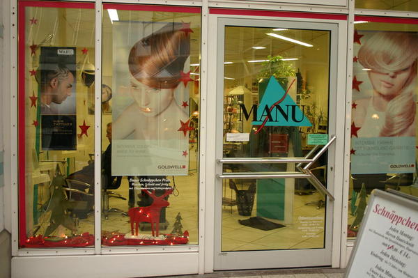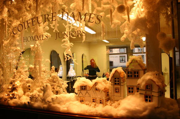 在連看三、四家品味類似的懷舊服飾店後,終於出現有聖誕擺飾的店家:某美髮沙龍;但和法國相較,只能說:「平平是鄉下美髮店聖誕擺飾,德法怎會差這麼多?」(見下圖)