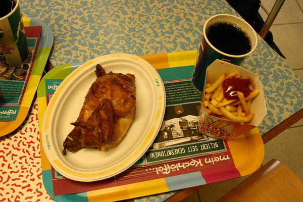 「沒關係,今天主要是來吃烤雞套餐的。」我如此地安慰自己後,便加速朝烤雞店前進。進了店裏,還在猶豫是不是該用英文點菜時,阿嬤店員就用流利的法文把我嚇了一跳。後來才發現,用餐區可說是滿坑滿谷的法國人,這真有種荒謬感。當然,那八語翻譯機再次派不上用場。