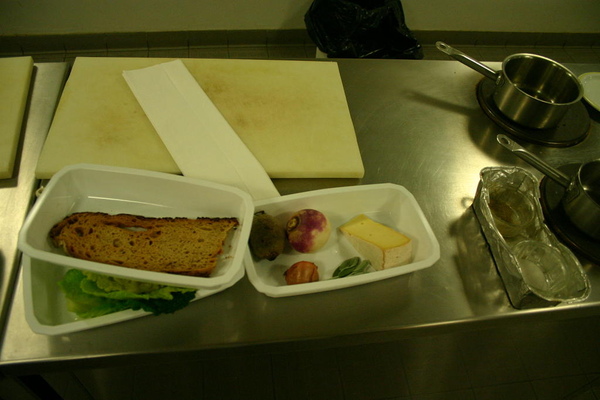 從左到右所要準備的食材為:烤乾的鄉村麵包片(Poilane)、四葉包心菜葉(chou vert)、生的甜菜頭(betterave)、白蘿葡(navet)、紅蔥(échalot)、鼠尾草(sauge)些許、150克的起司(St. Hectaire fermier)、鹽、胡椒。