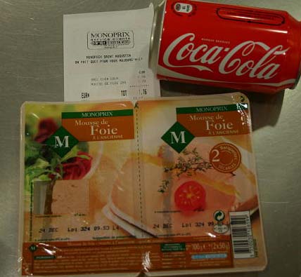 答案是:包包裏還有昨天上廚藝課做的麵包,所以我就進去超商,買了這二個東西來配麵包,學流浪漢,在路邊找個長椅滿解決我的晚餐;可口可樂一罐台幣24元、鴨肝醬糜台幣50多元,加起來還比那Hediard買的甜點便宜。