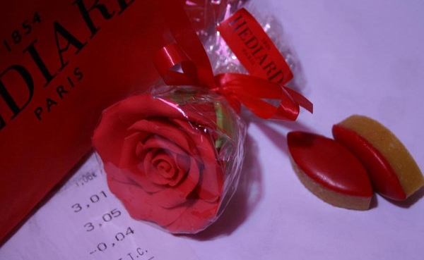 我痛下殺手,花了130元台幣(三歐一錢),買了一朵玫瑰、二顆「卡你送(給你爽台語發音)」,糖玫瑰是送Jenny的,而來自南法配方的杏仁水果軟糖「卡你送」,則是我最愛的甜食之一;這二物都是秤斤量兩賣的,為了應付我這種「買二顆」的客人,我想他們必需配有很精密的電子秤。