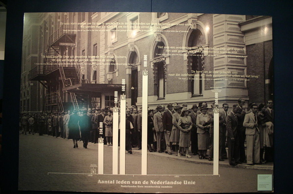舉個例子,當德軍入境後,二個重要的荷蘭政黨出現:尼德蘭聯合黨、荷蘭納粹黨;鐵蹄下,二個當然都是親德政黨,為首者都是不折不扣的荷奸,但在短短幾個月,前者就號召了人山人海的黨員,人們還排著隊,等待加入此「荷奸黨」;展覽訴說著當時黨員的動機:「沒有其他黨可加入的,我至少在這裏,可表達我的民族情感,所以,這也算是一種抵制的行動吧。」「我們不要再回到過去,那種舊政黨孤立主義的年代了。」(註:二次大戰之間,荷蘭社會分有四類別社群,各自活在其社群內,社會分裂嚴重。)