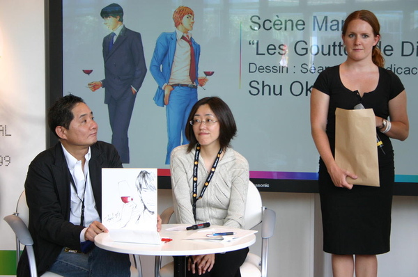出發前不久才看完《神之雫》,到現場就看到作者本人,這是一部講述法國紅酒有多神(多扯)的漫畫;和《小天使》相同,不少台灣人是通過這些日本著作,深入接觸了歐洲事物,這是無庸置疑的;但另一方面,不少歐洲人也是透過日本,接觸了東方元素,這還包括了中國的部份,如三國志、春麗這些作品;也就是說,面對歐洲人,日本人也代理起中國文明,因為現階段中國無法如此成功地外銷自屬文化,其「文化載具」尚未發展成熟,這指的是漫畫、電視電影、電玩、流行(化粧、服裝…)、設計性商品、遊戲、出版、展覽…,沒有這些文化載具,文化傳播只能在漢學界、藝術電影圈、美術界這些小眾間繞。