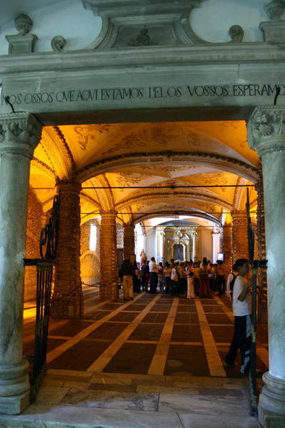 剛入內時,吵鬧小學生所營造的熱鬧氣氛,讓我一時忘了我現在參觀的可不是聖母院,習慣性地先往柱頭上的裝飾一看,「啊~~~~」是數顆骷顱頭對著我瞧,嚇得我趕快把視線移到柱腳,「啊~~~~」還是一堆骷顱頭,那…看看牆上的裝飾好了,「啊~~~~」一面由無數的人骨和骷顱組成的壁飾,無助地抬頭望向天花板,更多的骷顱頭,排列得更花俏,天啊! 我是不是來到了「娜娜鬼屋」,這個地方,簡單一句話,一堆死人骨頭!!「啊~~~~啊~~~~啊~~~~」