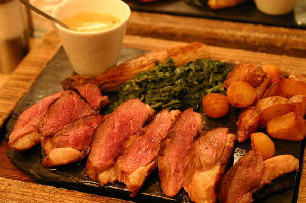 在生食/半生食之世界,不是只有獸類、魚類可嘗,在法國,半生的禽肉,一樣可溶化人類的舌頭;Magret de Canard 是法國西南最知名的美食之一,就我的感覺,就是把鴨胸當牛排吃,如這張相片,我點的是五分熟,肉上可是紅通通一片,視覺上可生猛的很,咬感也與高級牛排很像,不像之前想像的:鳥類的肉是絲條狀的。如果我從沒吃過這道菜,有人騙我是高級牛肉,我一定會相信。