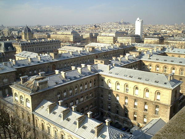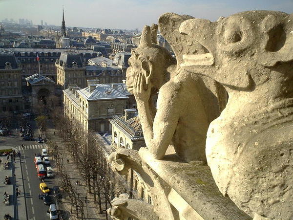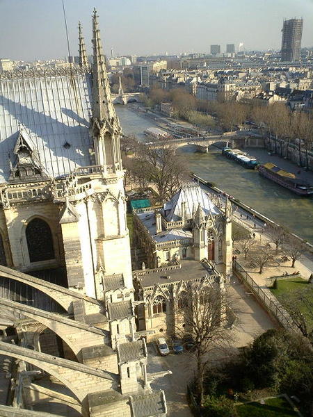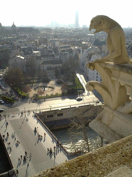 天氣正好,巴黎一覽無遺,巴黎是法國的中心,而聖母院又是巴黎的核心,所有的門牌號碼,都從這裏往外擴散;我看到布隆尼森林背後遠處有座山,也看到像四本大書的國立圖書館,其他眾所知曉的景點,沒有一個是看不到。我忙著指認一些建築物,但一直張冠李戴,但其實除了帶頭小妹外,其他土生土長的巴黎小女孩也好不到哪裏去,畢竟觀看高度不一樣,誰會知道萬神殿的圓頂從上往下看會是長怎樣?