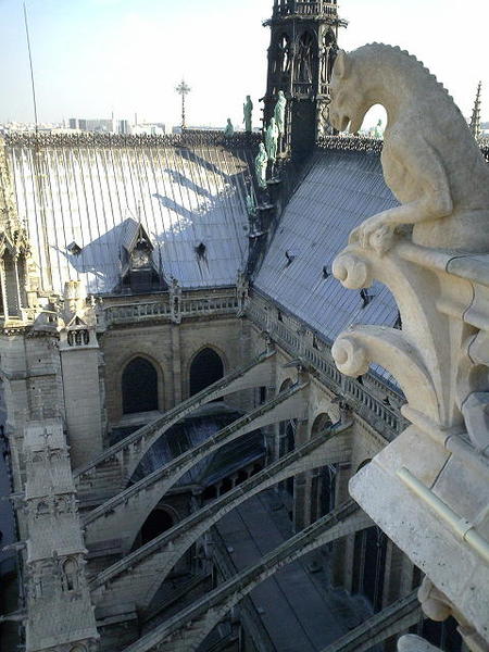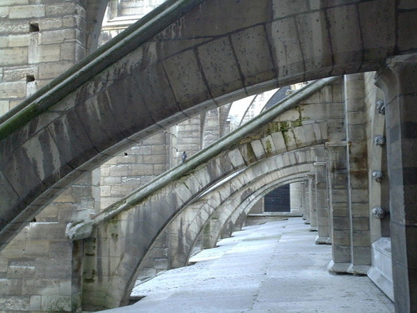 鑽過去後,是一個正常而言只有鴿子到得了的大天台,而歌德式建築的特徵:扶壁,就在我們身旁,從來沒想過自己會有一天能這麼接近它;不過,帶頭小妹警告我們不得太靠近邊緣,以免讓建築物腳下的人們看到:「這個地方是不應該出現人影的,會嚇到人家。」「是的,五百年前,妳先祖就躲在這個四方都沒有人會看到的地方,偷偷晒太陽。」我心裏如此回答。