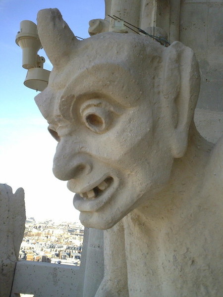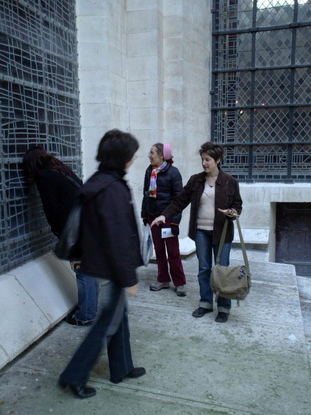 我們先在學校的餐廳喝杯咖啡,等人都到齊了,一行五人搭公車前往不遠處的巴黎聖母院,那時聖母院下午場仍未開放,排隊人蛇卻已有半百公尺之長,只見帶頭小妹向守門員說了些話,便帶我們在眾目睽睽下長趨直入,連門票都沒買,更扯的是,她到了賣場後,跟賣場大叔要了一把看起來有幾百年的籲匙,打開附近一個奇怪的小門,要我們鑽進去。