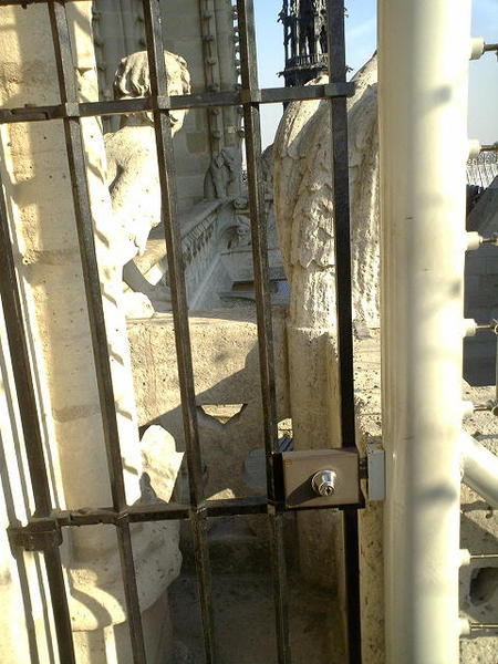 到了該處時,聖母院已開放,這裏堆滿各國觀光客,但我們不用跟這些人擠,因為最頂層只開放一角,她開了一鐵柵門,要我們迅速進入,再速速關上;之後東繞西繞,都是我們的專享天地。
