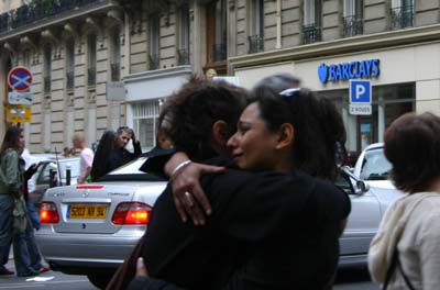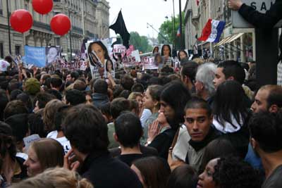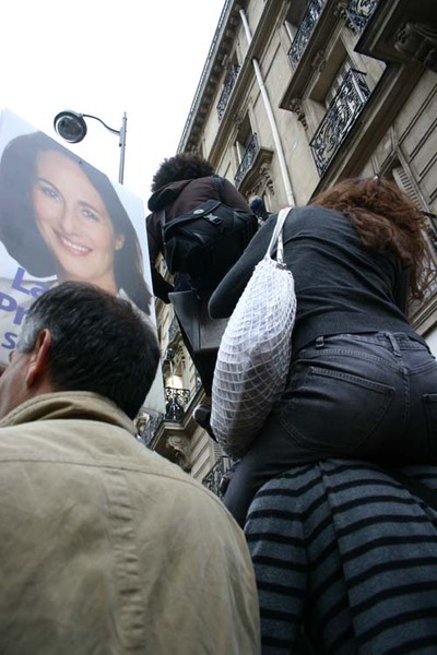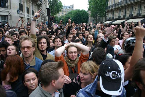 這一張圖是我在巴黎大學路上的法國社會黨總部前拍的,時間很明顯是八點整,螢幕上出現的人頭是Sarkozy,這表示依出口民調,勝利是屬於對手的,而且差距頗大,驚訝、失望、憤怒、不屑的情緒馬上出現在群眾臉上,輸了!真的輸了!全場噓聲像龍捲風昇起,初時震耳,但漸漸遠去,消失在遠空,卻帶不走整場沈重的情緒。