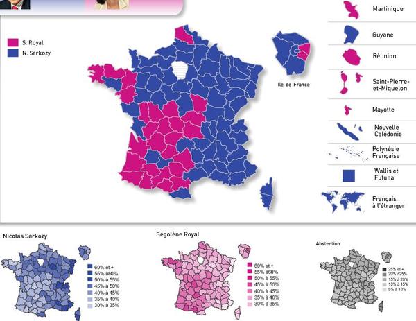 選舉結果,連結見世界報;法國的政治傾向呈現明顯的東西分裂。