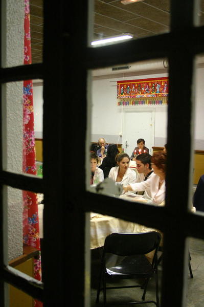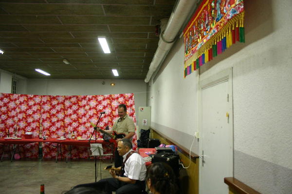 吃到子夜後才結束,餘興節目開始登場;圖中的人正在唱「月亮代表我的心」。遠方紅布將配菜間與客席分開。